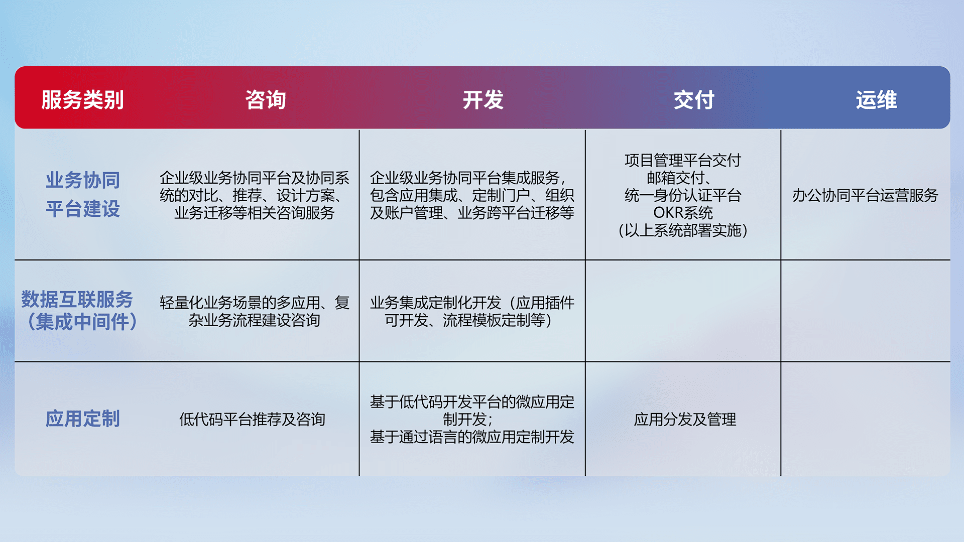 针对钉钉、、、企微、、IDaas等平台级产品提供产品的规划、、、、方案、、交付、、、、定制化开发等服务,,,实现如统一协同办公、、智能客户服务、、、混合会议管理、、、、智能数据查询、、、、等业务场景,,,实现数字化转型。。。